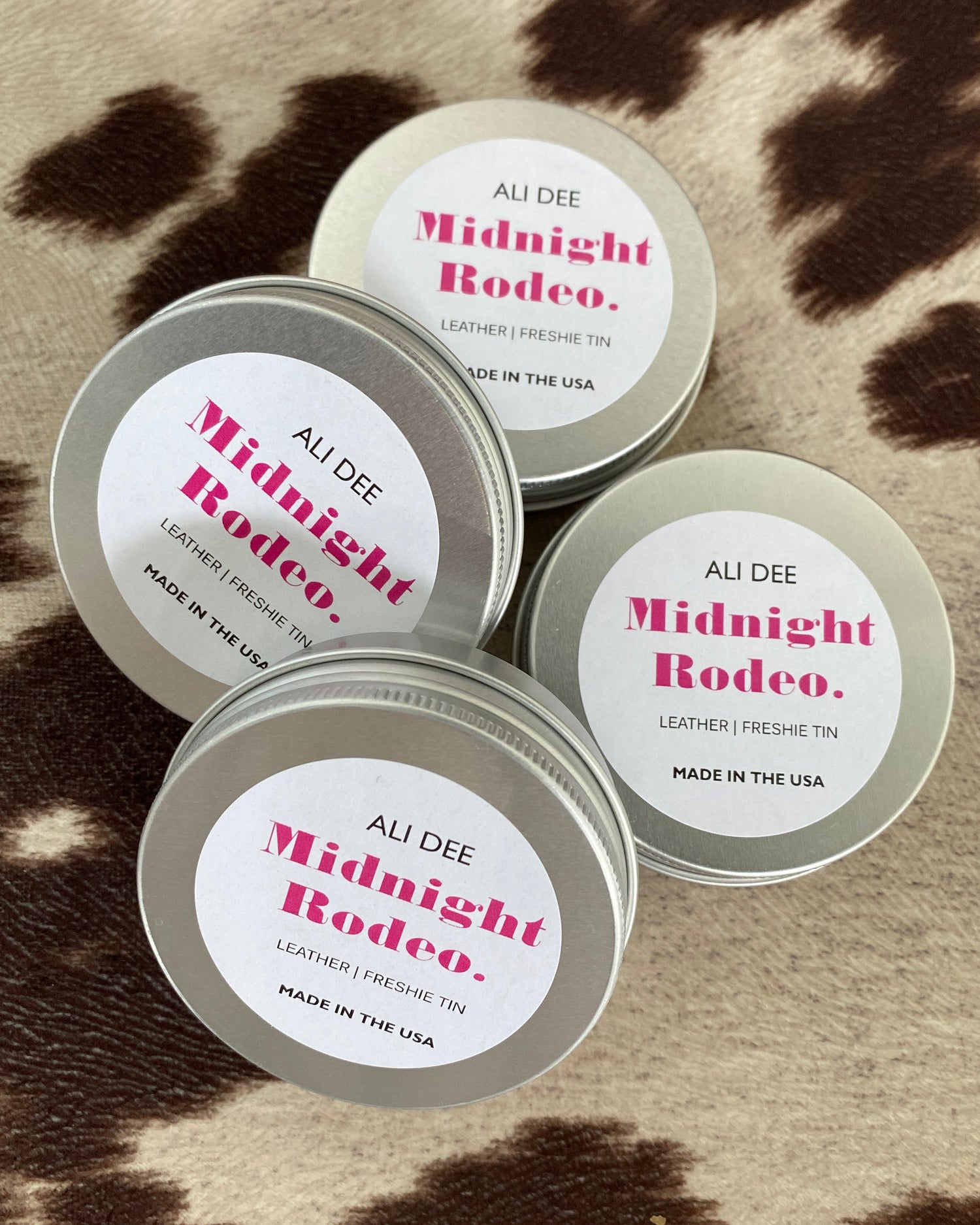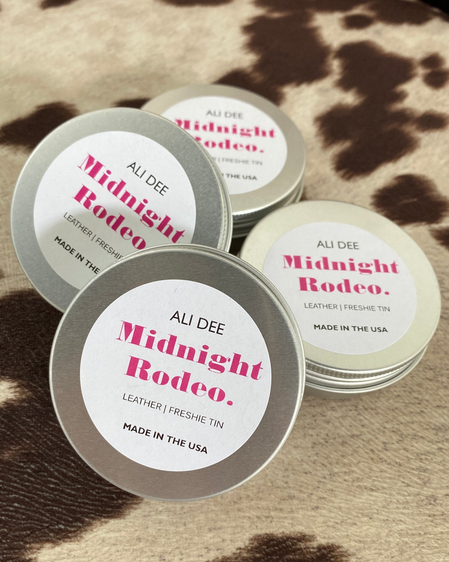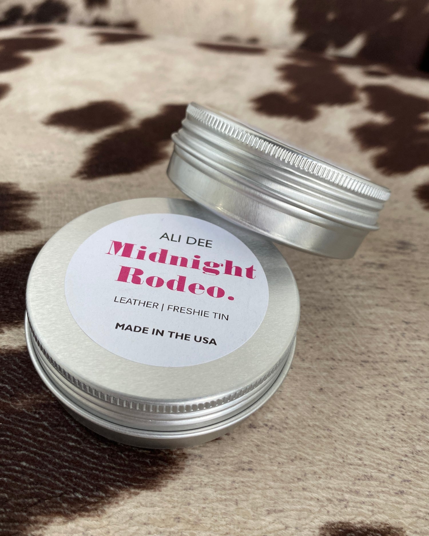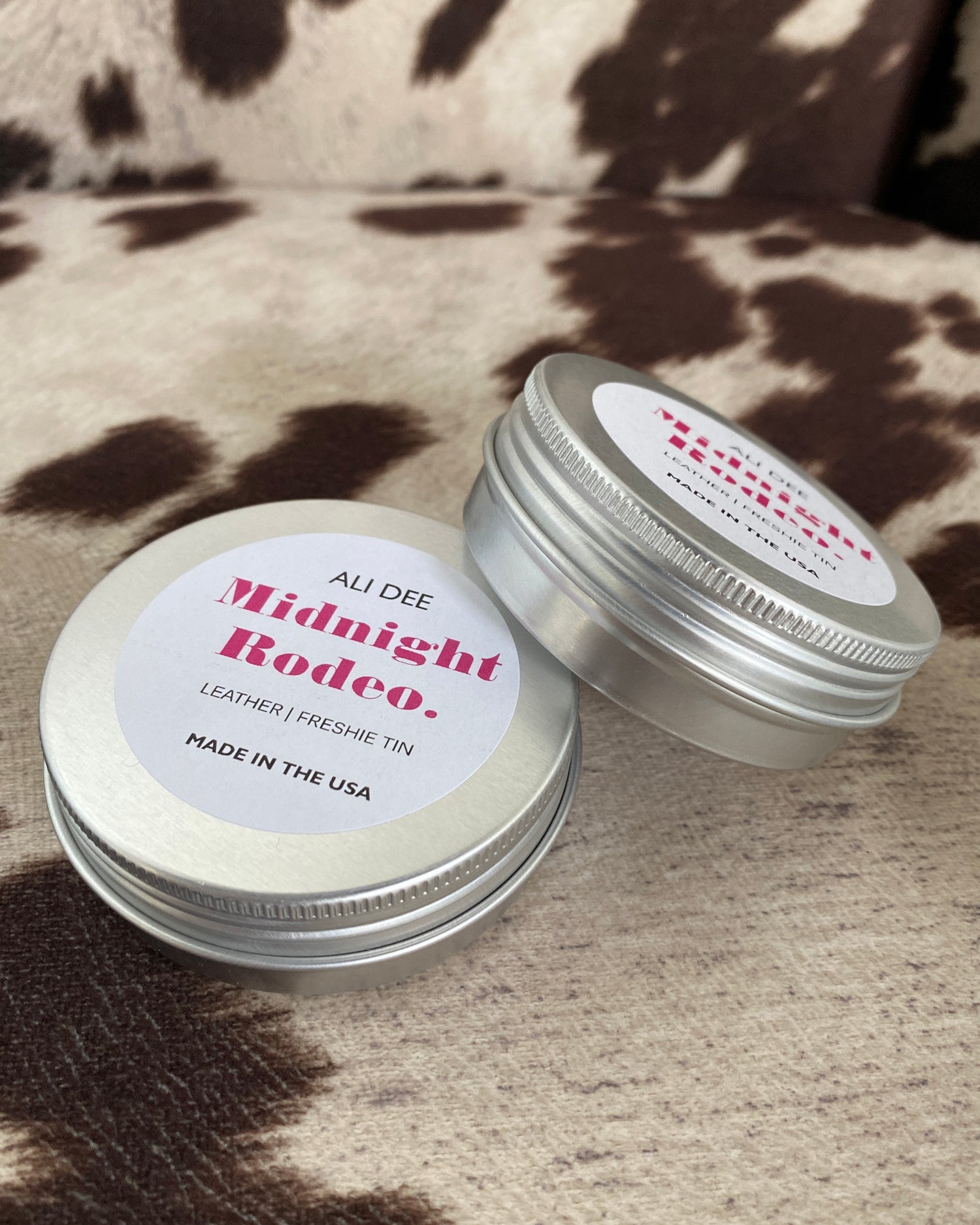 Login to view price.Midnight Rodeo Freshie Tin by Ali Dee features the popular leather scent described as a leathery saddle aroma, with a rustic and inviting fragrance.