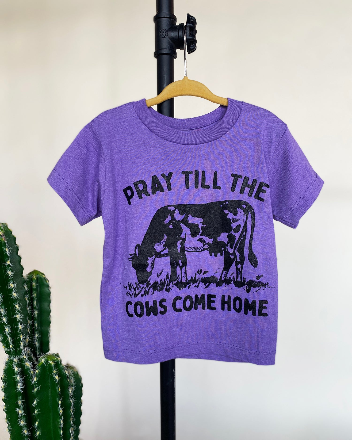 Login to view price.Ali Dee Toddler Pray Till The Cows Come Home western graphic tee in heather purple with black screen printed artwork.