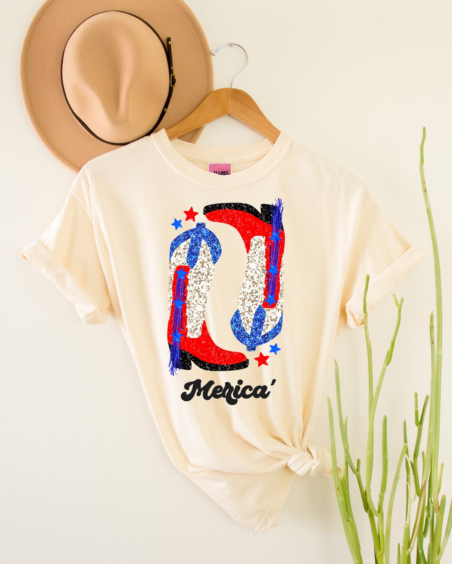 Login to view price.Americana Cowgirl Boots wholesale graphic tee by Ali Dee features a unisex fit body in vintage white with Americana inspired cowgirl boots, full color artwork made to look like glitter.