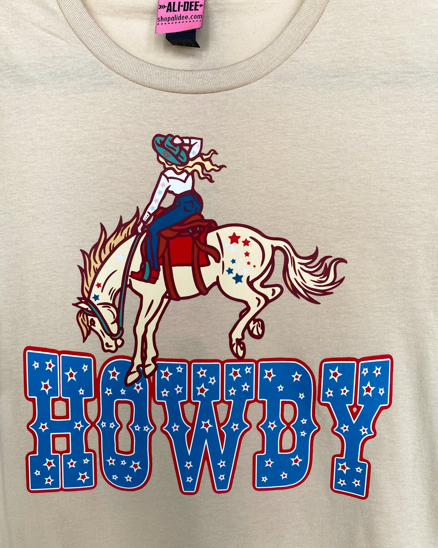Login to view price.Howdy Americana Cowgal wholesale graphic tee by Ali Dee features a unisex fit body in sand with patriotic cowgirl western inspiration, full color artwork.