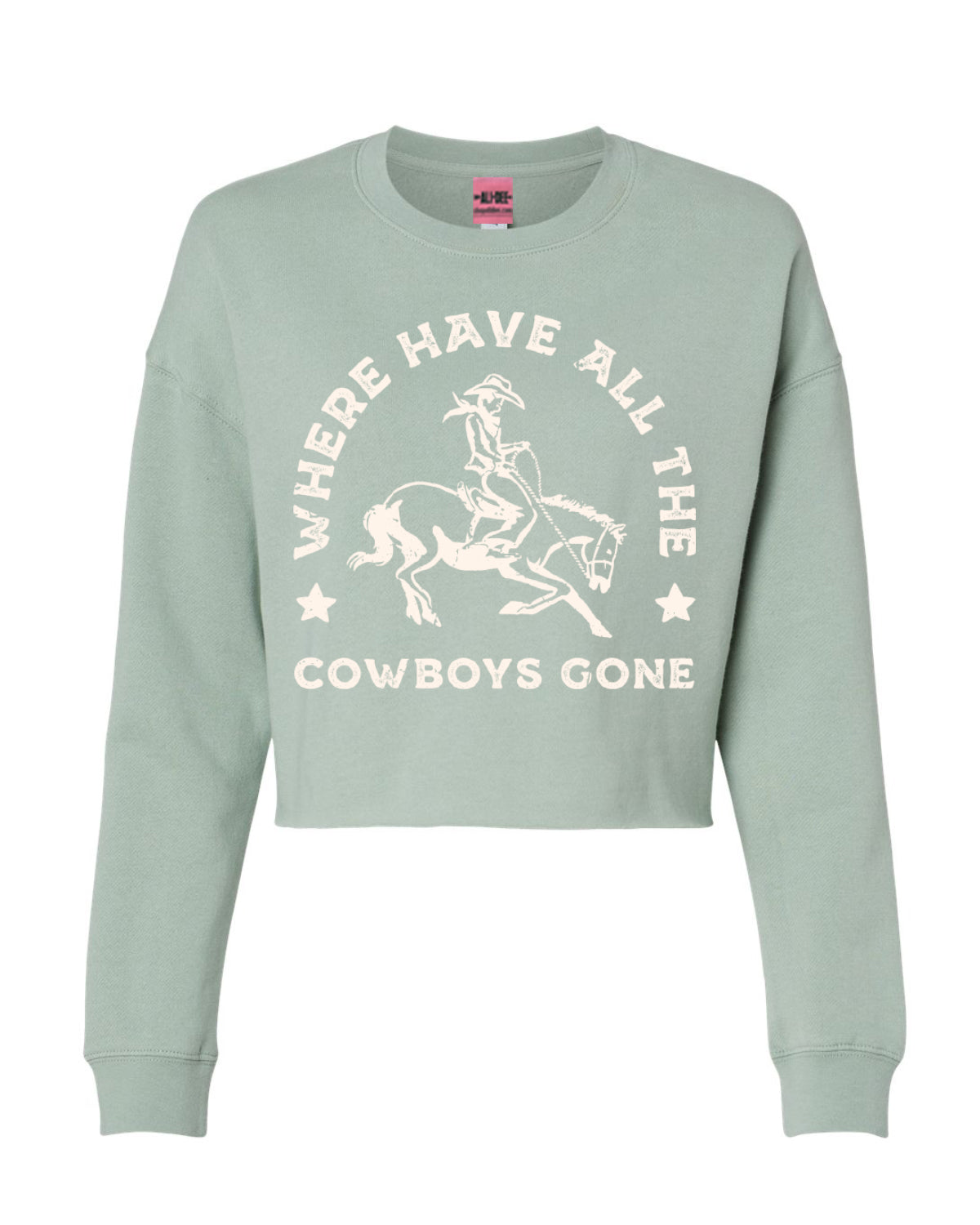 Where Have All The Cowboys Gone western graphic cropped sweatshirt by Ali Dee features a cropped sweatshirt body in sage with cream screen printed art.