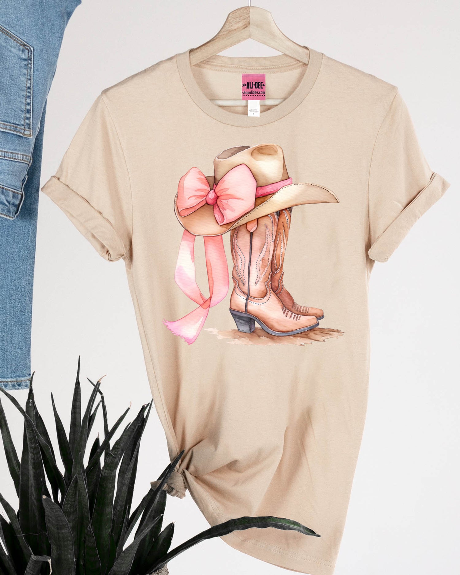 Login to view price.Coquette Cowgirl wholesale graphic tee by Ali Dee features a unisex fit body in sand with coquette inspired cowgirl boot and bow, full color artwork.