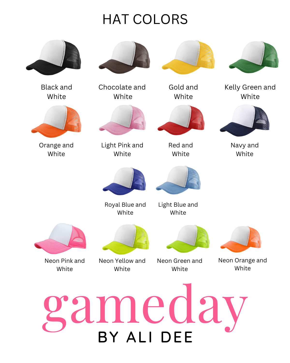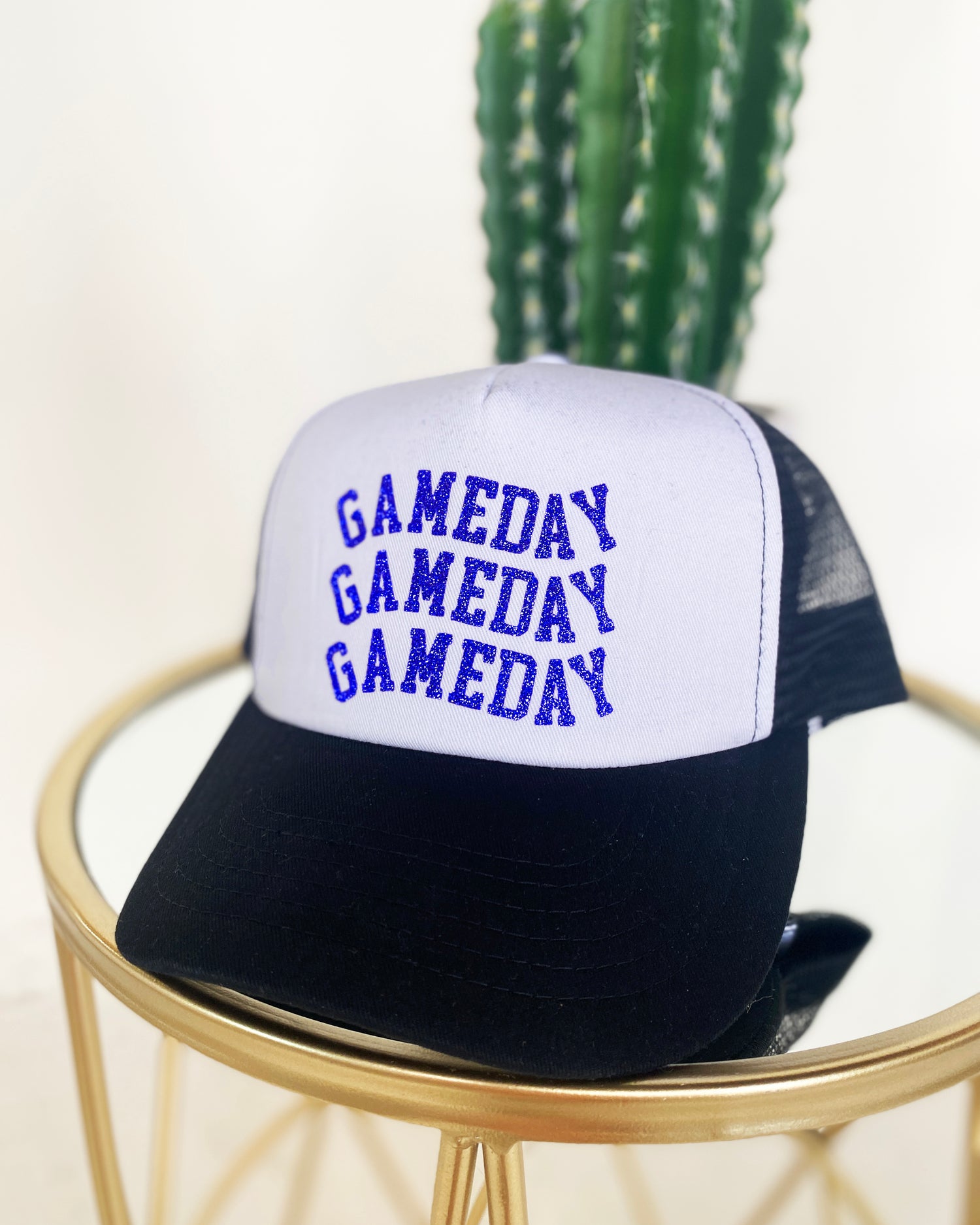Gameday Three hat features three wavy retro gamedays on front of trucker hat.