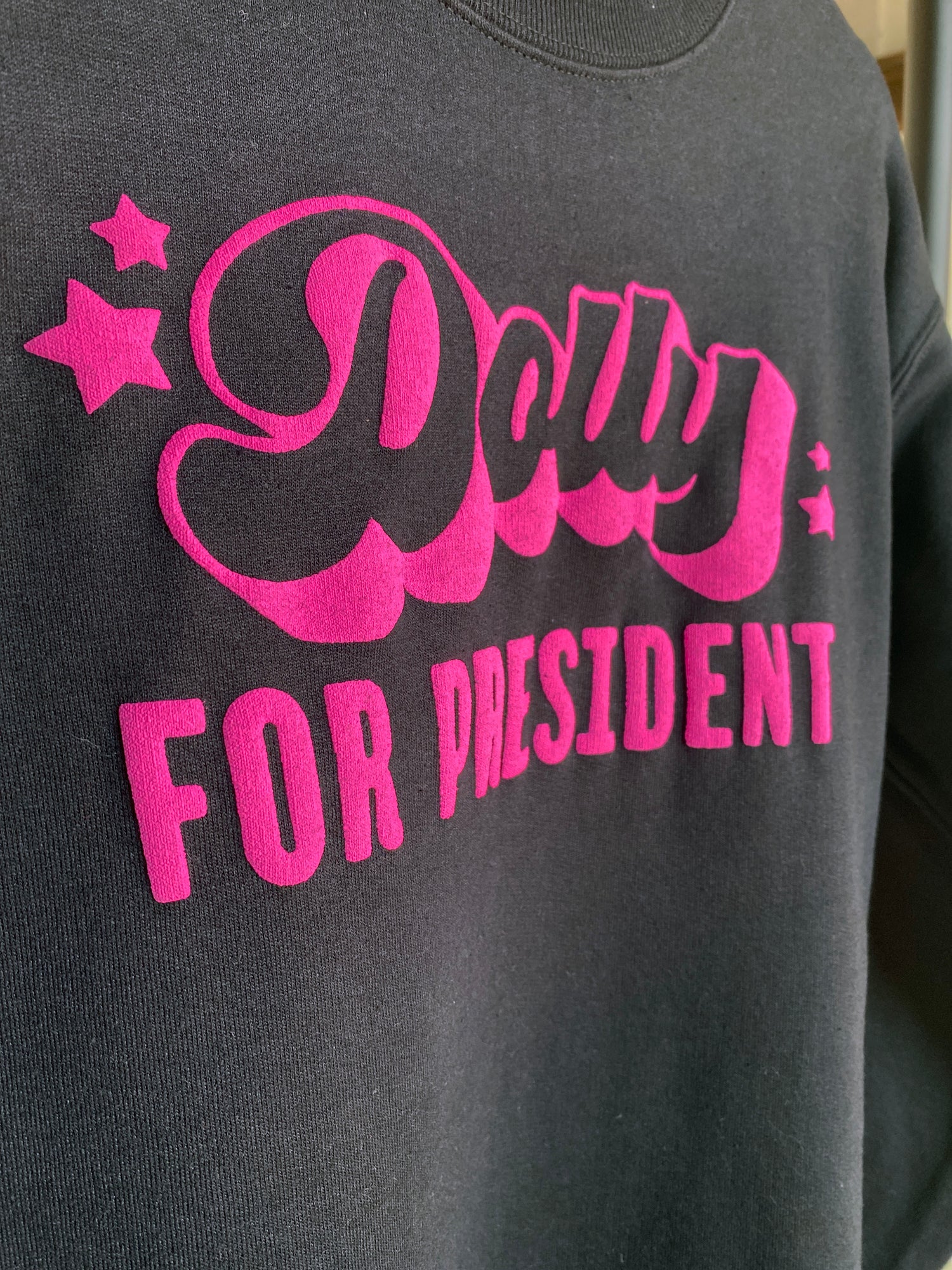 Login to view price.Dolly for President wholesale graphic sweatshirt by Ali Dee features a unisex fit sweatshirt in black with hot pink puff screen-printed art.