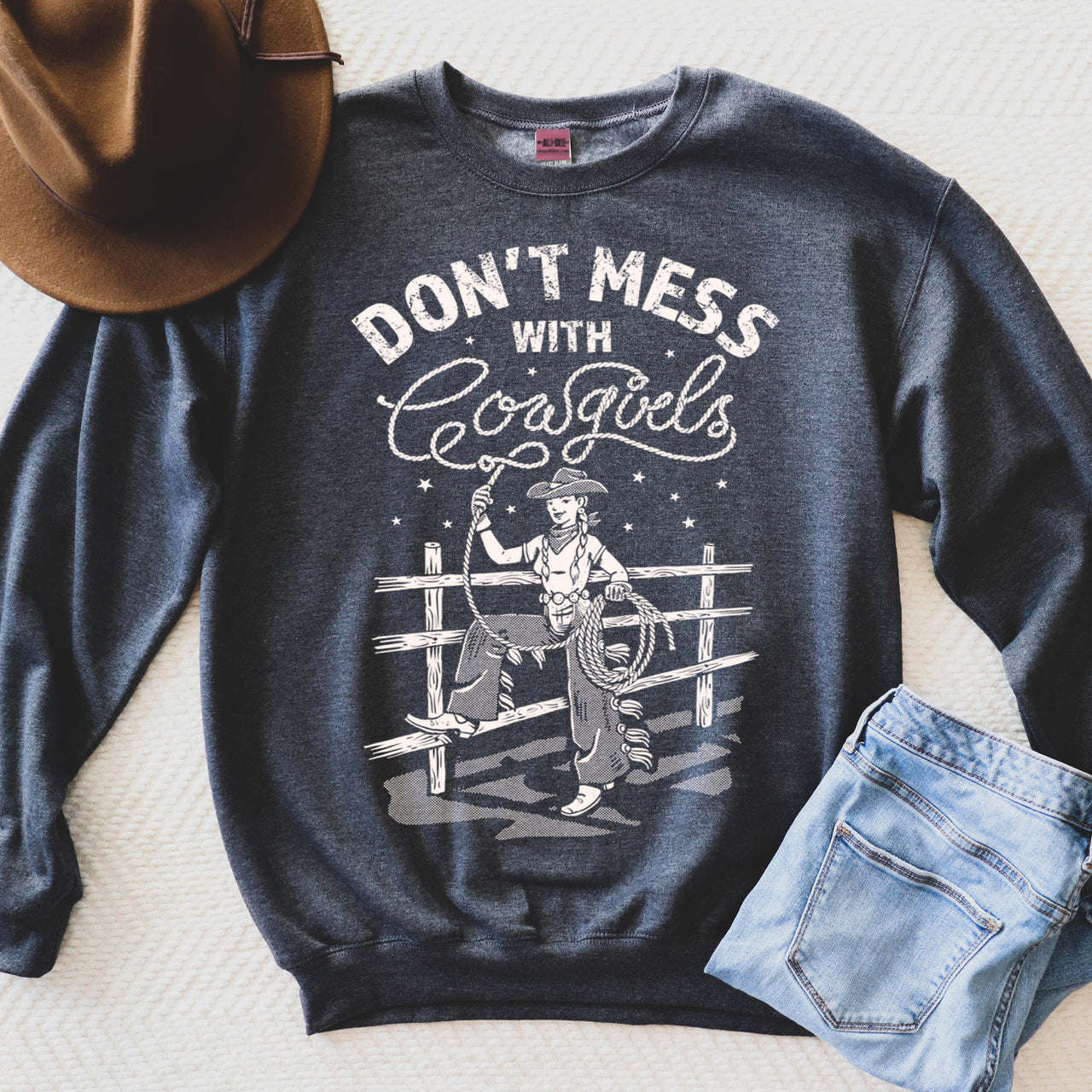 Login to view price.The Don't Mess With Cowgirls Sweatshirt features a heather charcoal super soft unisex body crewneck with cream screen printed art.