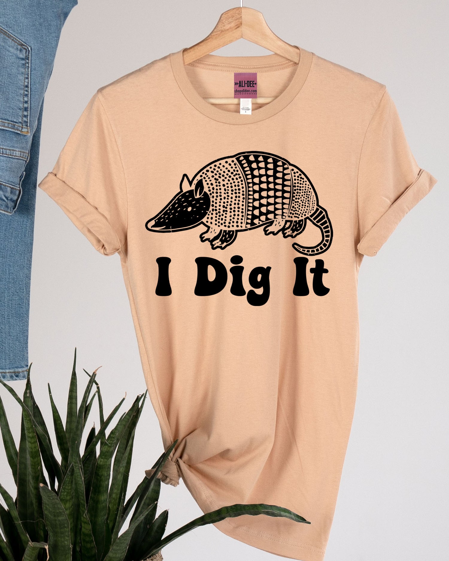 Login to view price.I Dig It wholesale graphic tee by Ali Dee features a unisex fit body in heather sand dune with black screen-printed artwork.