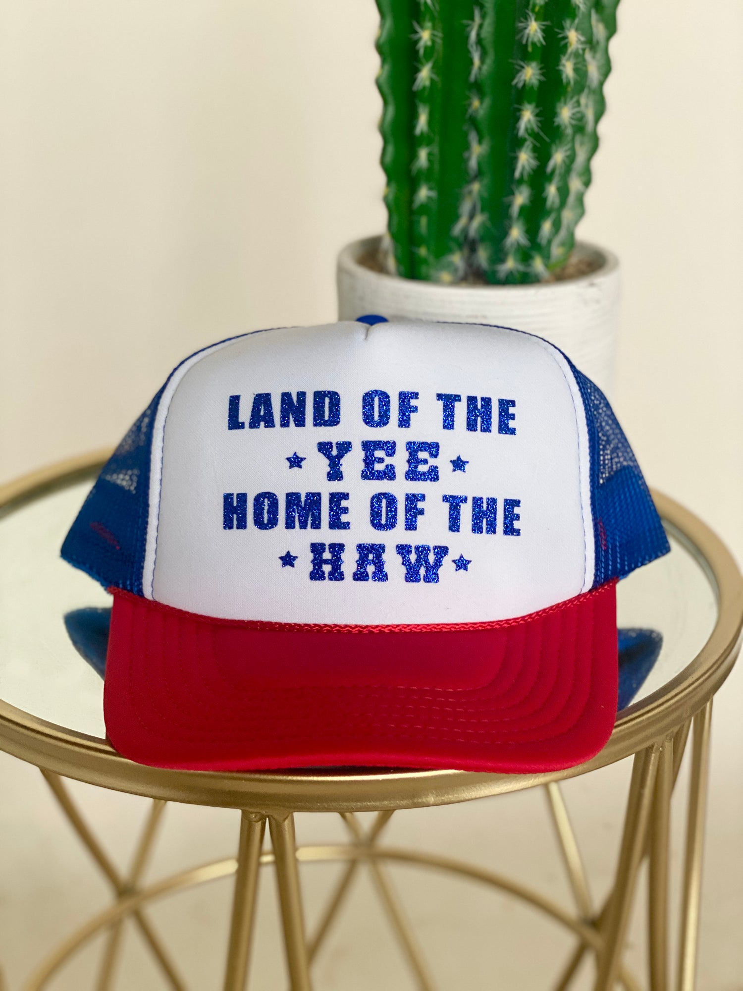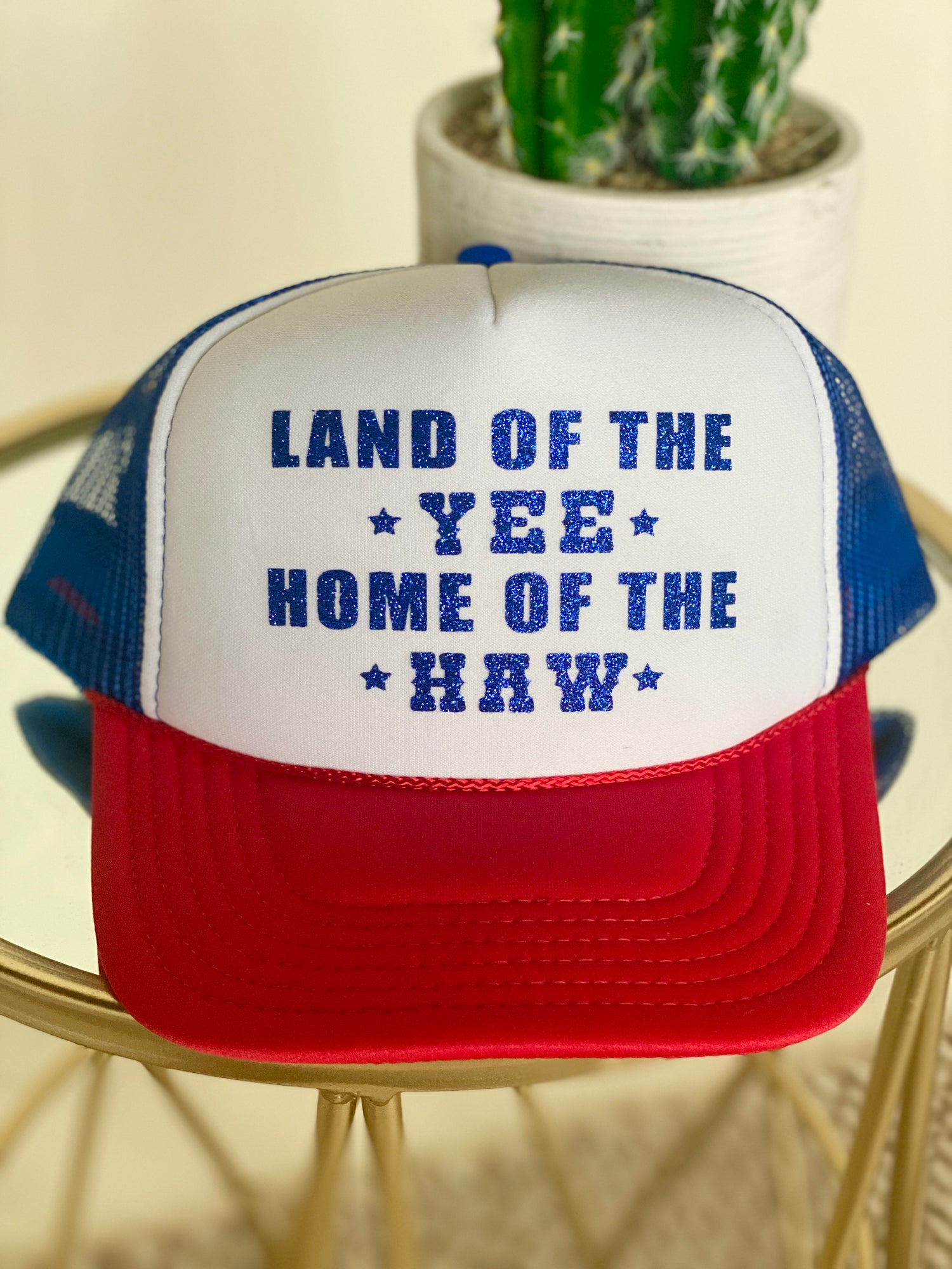 Land of the Yee Home of the Haw Glitter Trucker Hat - Red White Blue