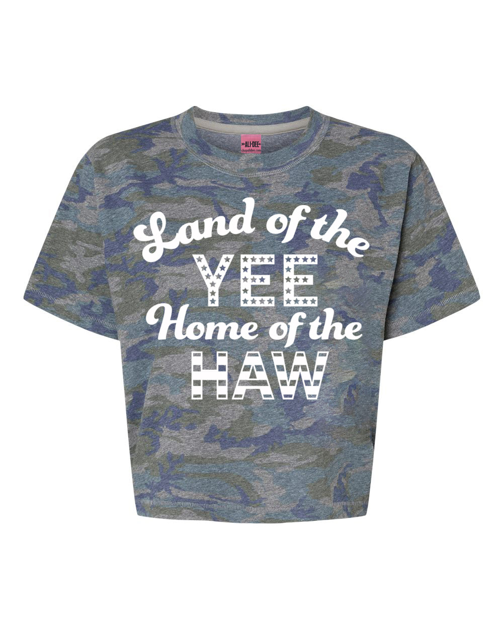 Land of the Yee Home of the Haw Western Graphic Modern Crop Tee - Vintage Camo