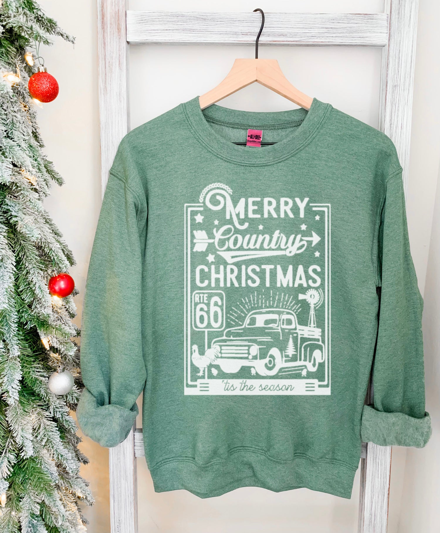 Login to view price.Merry Country Christmas wholesale graphic sweatshirt by Ali Dee features a unisex fit sweatshirt in heather sport green with white screen-printed art.