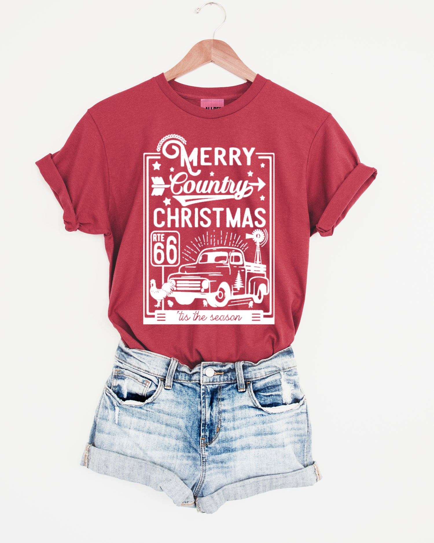 Login to view price.Merry Country Christmas wholesale graphic tee by Ali Dee features a unisex fit body in heather canvas with white screen-printed art.