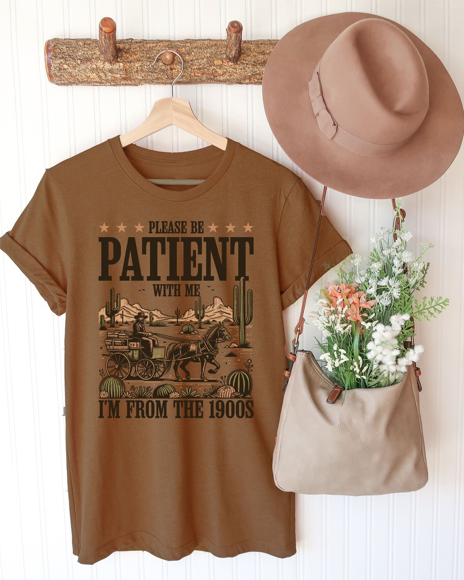 Login to view price.Please Be Patient with Me I'm from the 1900s wholesale graphic tee by Ali Dee features a unisex fit body in vintage brown with full color artwork.