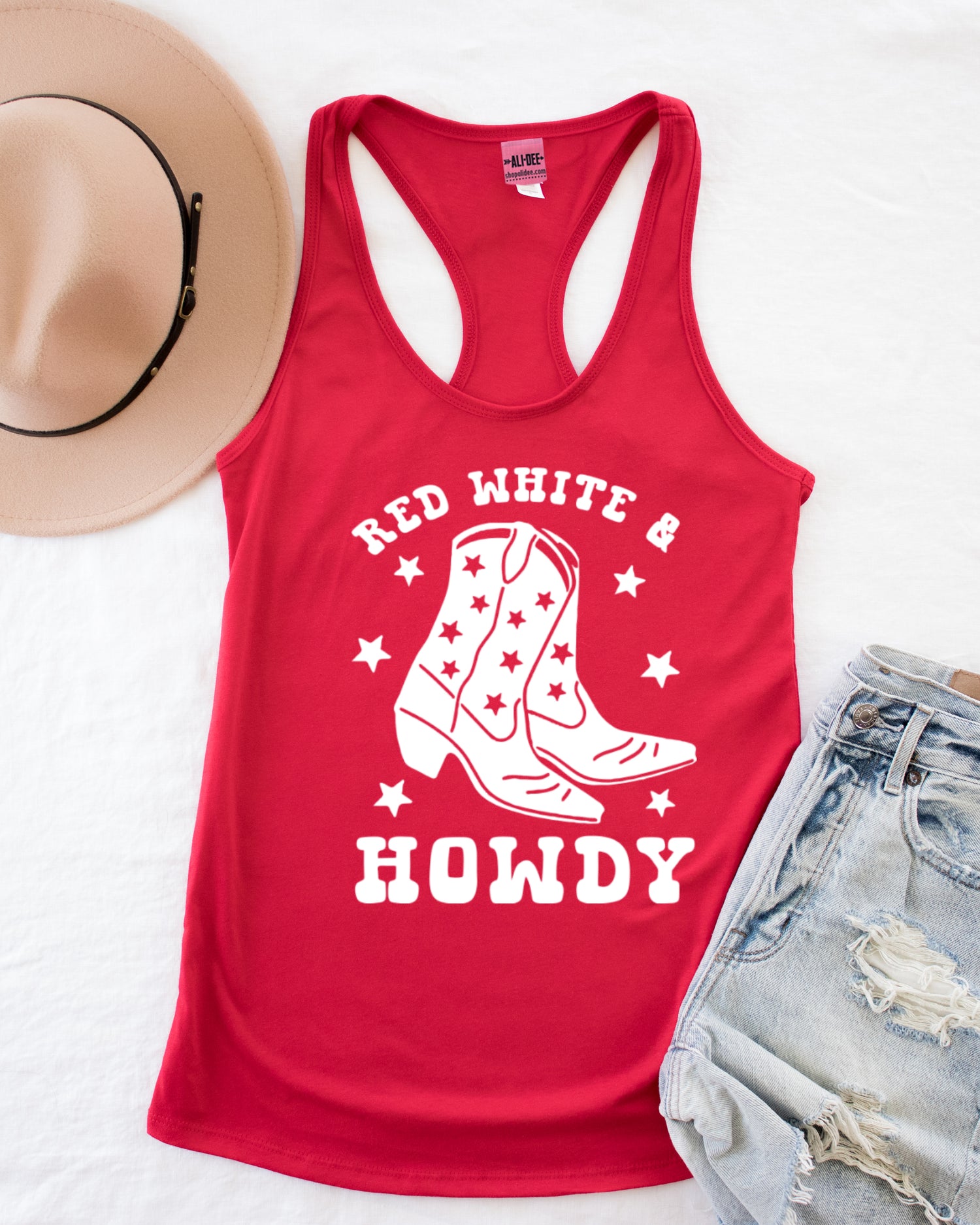 Red White and Howdy graphic tank by Ali Dee features a racerback tank body in red with white screen printed art.