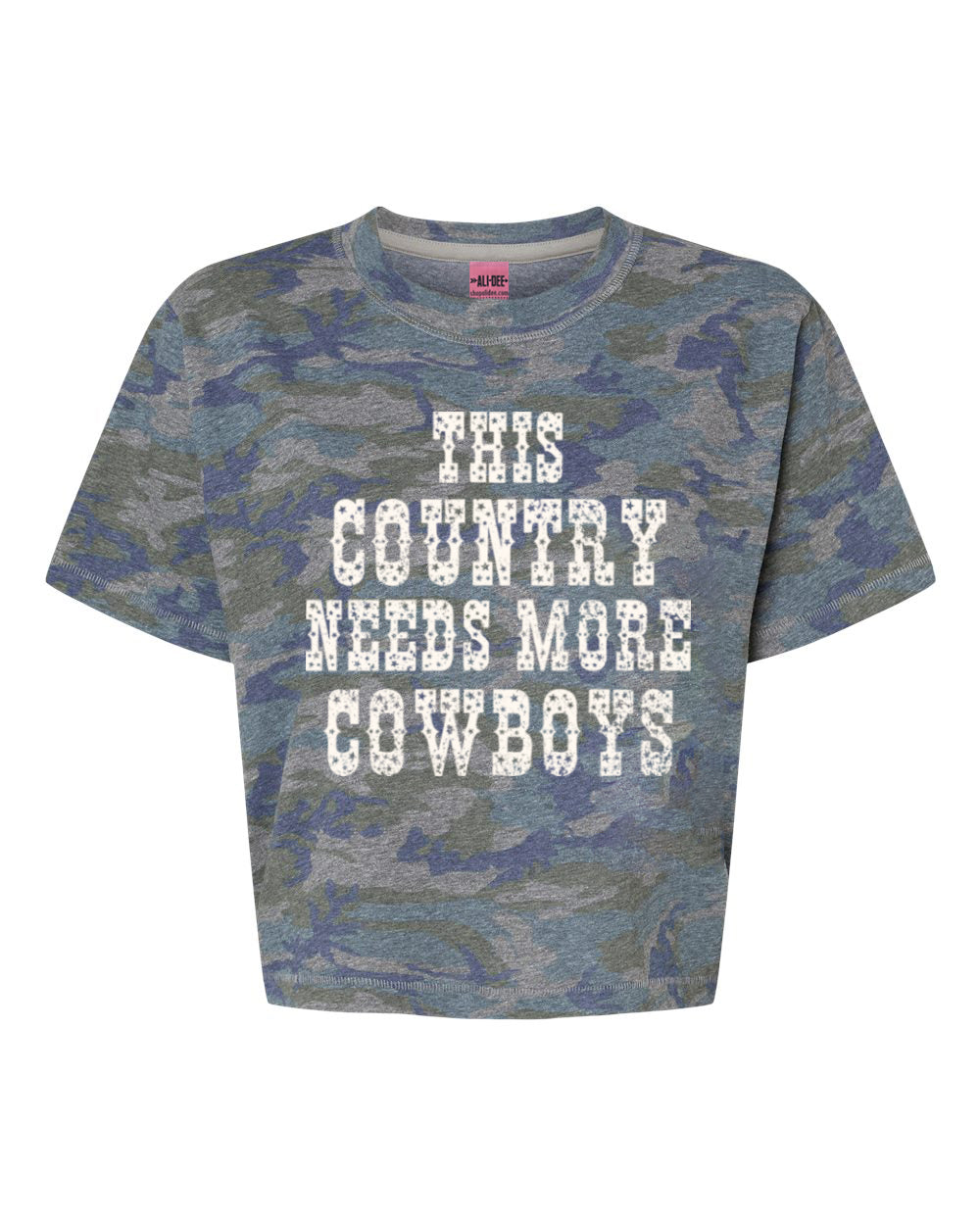 Login to view price.This Country Needs More Cowboys western graphic modern cropped tshirt by Ali Dee features a cropped boxy modern t-shirt body in vintage camo with cream screen printed art.
