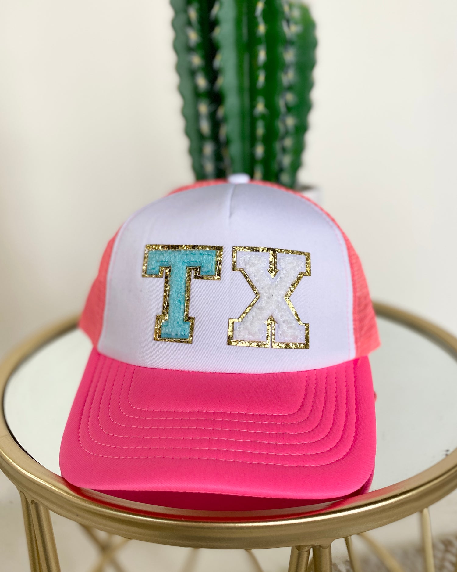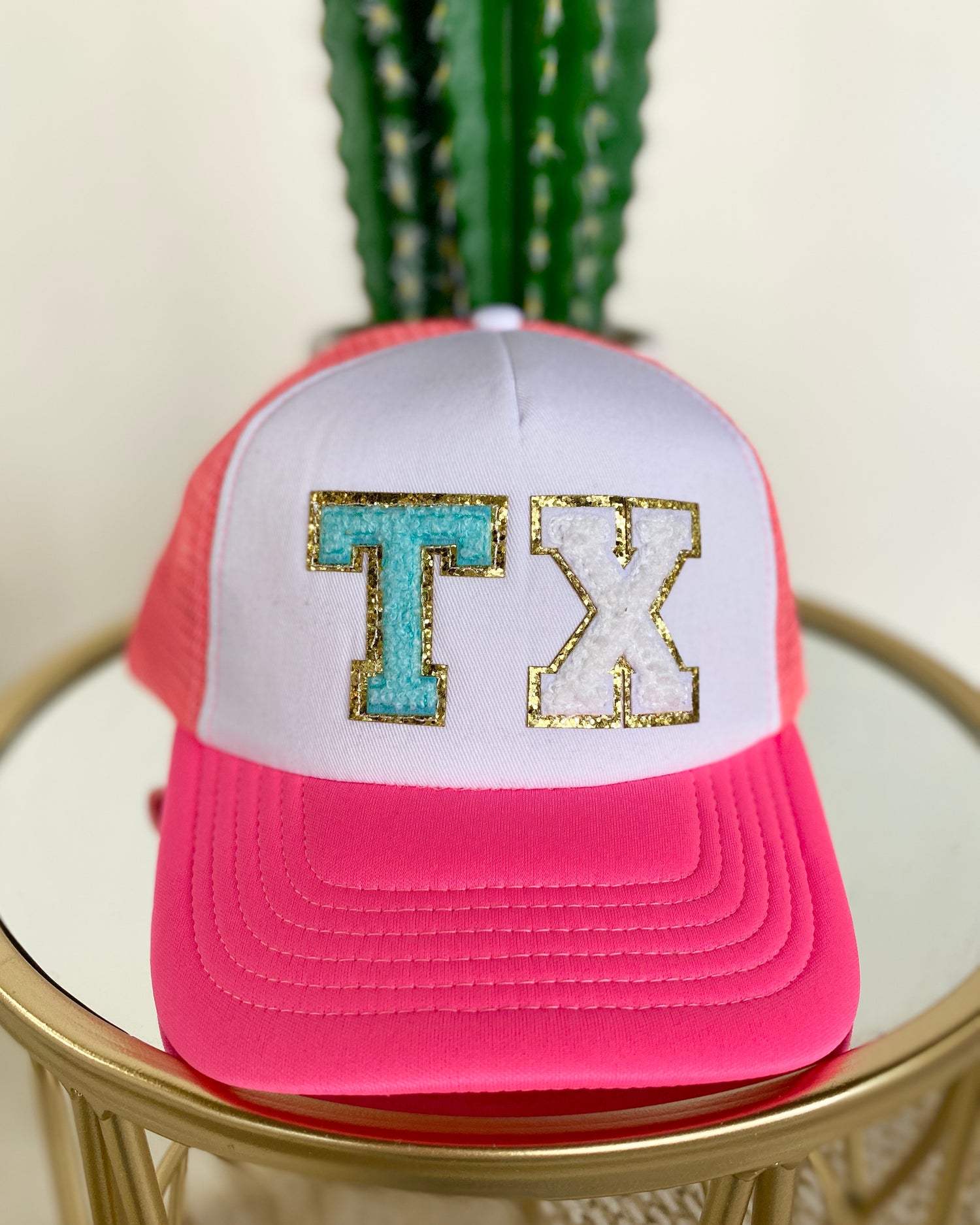 Login to view price.Neon pink and white front mesh back adjustable snap trucker hat with colorful TX chenille letters.