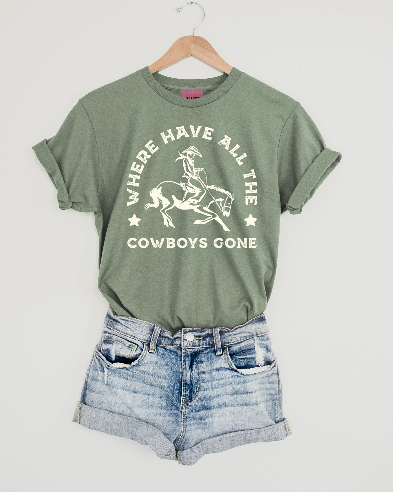 Where Have All The Cowboys Gone western wholesale graphic tee by Ali Dee features a unisex fit body in heather sage with cream screen printed art.